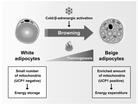 Adipose tissue is the major organ that controls the overall energy homeostasis in a living organism. Briefly, in excess energy conditions, the adipose tissue stores the superabundant nutrients in the form of triglycerides, whereas during scarcity of energy, it supplies the nutrients to other tissues through lipolysis [13]. In mammals, there are two different types of adipose tissues, namely, white adipose tissue (WAT) and brown adipose tissue (BAT). Interestingly, WAT and BAT have opposite functions. The WAT stores excess energy as triglycerides, while the BAT is specialized in the dissipation of energy through heat production for maintaining the body temperature and energy consumption. Recent studies have demonstrated that beige adipocytes sporadically reside with white adipocytes and emerge in response to certain environmental cues. Beige adipocytes have the antagonistic functions of WAT and agonistic functions of BAT at the same time. In the basal state, beige adipocytes act as white adipocytes; however, when given signals that require heat production through energy consumption such as cold stimulation, these cells demonstrate BAT-like function and morphology [14].