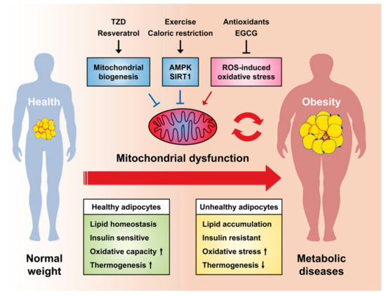 Therapeutic interventions for obesity and metabolic diseases by targeting mitochondrial regulation: Mitochondrial dysfunction due to impaired mitochondrial biogenesis and ROS -induced oxidative stress diminishes the role of the adipocytes. Therefore, mitochondrial dysfunction causes obesity and metabolic diseases, which in turn has a vicious cycle that leads to mitochondrial dysfunction. Recently, treatment of metabolic diseases has been suggested to involve induction of mitochondrial biogenesis in response to TZD and resveratrol treatment or by controlling mitochondrial function. In addition, mitochondria-targeted antioxidants and/or EGCG mitigate mitochondrial oxidative damage. Reactive oxygen species (ROS); Thiazolidinedione (TZD); Epigallocatechin-3-gallate (EGCG); 5’-Adenosine monophosphate-activated protein kinase (AMPK); Sirtuin 1 (SIRT1).