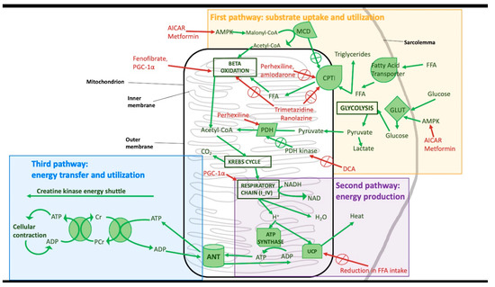 Cardiomyocytes′ energetic metabolism is a crucial feature of myocardial contractile function. Three components define it: substrate uptake and utilisation (using beta-oxidation and glycolysis), energy production (mitochondrial oxidative phosphorylation), and energy transfer and utilisation (ATP consumption by the creatine kinase energy shuttle). Alterations in those components may have a pivotal role in the pathophysiology of HF [8]. Furthermore, the modulation of these metabolic alterations has been proposed as a promising new target for its therapy.