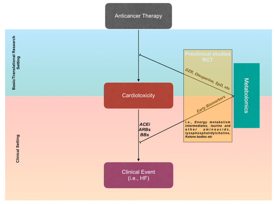 Future challenges of metabolomic studies. Translational research could accelerate the development of cardioprotective agents to be introduced rapidly in clinical practice. On the other hand, the identification of metabolite clusters associated with the risk of developing cardiotoxicity (CTX) could allow an early therapeutic intervention, before the occurrence of clinical events. Abbreviations: RCT: randomised clinical trials; ACEi: ACE-inhibitors; ARBs: angiotensin receptor blockers; BBs: beta-blockers; HF: heart failure.