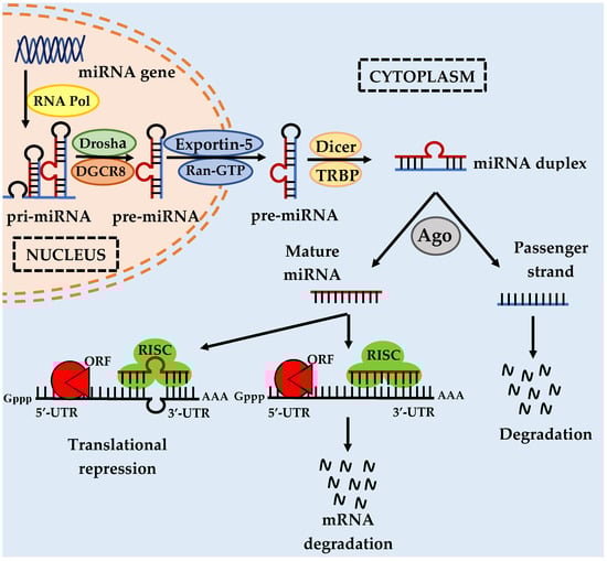 Pre-miRNAs are then transported from the nucleus into the cytoplasm by RanGTP-dependent nuclear transport reporter exportin 5 (XPO5) to undergo loop-cleavage by another RNase III enzyme known as Dicer, with the aid of transactivation response RNA binding protein (TRBP) for generating an approximately 20 nt-long mature miRNA/miRNA* duplex, as shown in Figure 1 [16,17,18,19]. The miRNA duplexes are then incorporated into a member of the Argonaute (Ago) protein subfamily, facilitated by the Dicer–TRBP complex and resulting in the formation of RNA-induced silencing complex (RISC) [18,19]. The miRNA duplexes are separated or unwound into two single strands by RNA helicases [20]. The guide strand (miRNA mature strand) remains bound to RISC, whereas the passenger strand (miRNA*) undergoes degradation [18]. The Ago protein-bound mature miRNA is subsequently assembled into an effector complex known as the miRNA-containing RNA-induced silencing complex (miRISC) [18]. Within the miRISC, the mature miRNA then binds, with its ‘seed sequence’ (nucleotide 2 to 8 from miRNA 5′-end), to the 3′-UTR (and, in some cases, 5′-UTR and open reading frame (ORF)) of the target messenger RNA (mRNA) [21].
