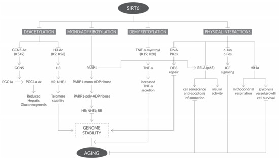 - Gertler, A.A.; Cohen, H.Y. SIRT6, a protein with many faces. Biogerontology 2013, 14, 629–639. [Google Scholar] [CrossRef] [PubMed]