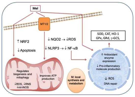 Melatonin crosses cell membranes and acts through membrane (MT1/2) and nuclear (ROR) receptors in order to reach different cellular organelles including mitochondria and nuclei. Melatonin’s antioxidant properties are characterized by its capacity to stimulate the production of antioxidant enzymes such as superoxide dismutase (SOD), catalase (CAT), heme oxygenase-1 (HO-1), glutathione peroxidase (GPx), glutathione reductase (GRd), and γ-glutamyl-cystein synthase (γ-GCS). Its antioxidant and cytoprotective properties are boosted by its ability to induce the expression of NRF2 and to bind and inhibit reactive oxygen species (ROS) through NQO2 in the cytosol. Melatonin can also inhibit NLRP3 inflammasome and reduce NF-κB expression, leading to a reduction in proinflammatory molecules. Melatonin ameliorates DNA damage induced by external factors and has an antiapoptotic effect. At the mitochondrial level, it directly scavenges ROS and inhibits m-iNOS expression, which neutralizes both reactive oxygen and nitrogen species (ROS/RNS) in mitochondria, which improves oxidative phosphorylation and ATP production. Melatonin is synthesized and metabolized in mitochondria (M) and also plays an active role in mitochondrial homeostasis by regulating biogenesis and mitophagy. Therefore, it plays a major role in protecting the skin against damage caused by external factors.