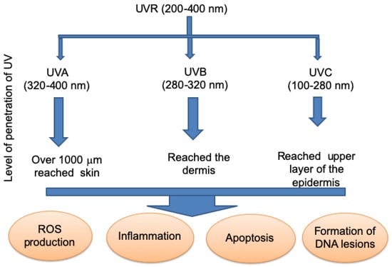 Ultraviolet radiation (UVR) with wavelengths between 200–400 nm is categorized into UVA, UVB, and UVC and can damage human skin. UVA penetrates the underlying sub-cutaneous tissues, UVB can reach the dermis, while UVC can only penetrate the upper layer of the epidermis. The exposure of the human skin to natural ultraviolet radiation (especially UVB) or artificially-generated UVR, produces damage caused by the production of reactive oxygen species (ROS), inflammatory processes, accelerated apoptosis, and the formation of DNA photo lesions.