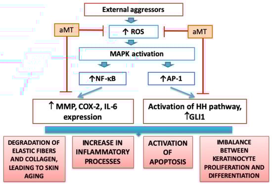 The mechanisms involved in skin damage induced by external aggressors as well as the protective actions of melatonin are summarized in Figure 3.