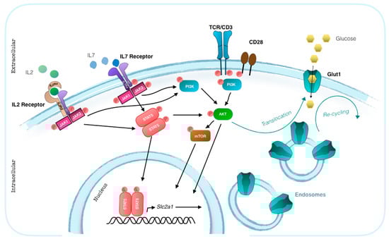 Of the fourteen members of glucose transporter family, T cells express Glut1, 3, 6 and 8 []. Glut1 is expressed at low levels on the surface of resting T cells and is up-regulated upon T cell activation. Similar to the insulin-responsive glucose transporter Glut4, Glut1 cell surface localization is controlled by extrinsic signals [] (Figure 3). In addition to TCR signaling, co-stimulation via CD28 engagement induces the expression and surface localization of Glut1 in T cells through the activation of the phosphoinositol-3 kinase (PI(3)K)-Akt pathway []. T cells have a cytoplasmic pool of Glut1 whose translocation to the cell surface is responsible for increased glucose uptake peaking at 48/72 h after activation []. This kinetic indicates that Glut1 translocation to the cell membrane is predominantly driven by the autocrine IL-2 production, and up-regulation of CD25 rather than directly from TCR engagement. Translocation of Glut1 to the cell membrane can indeed be induced also by stimulating resting T cells with the homeostatic cytokine IL-7, in the absence of antigenic or co-stimulatory signals []. In the absence on an immune response, IL-7 maintains the basal levels of Glut1 expression necessary for T cell survival. Glut1 trafficking is promoted by canonical common γc signaling []. The crosslink of IL-7 with the extracellular domains of IL-7Rα and γc results in the interaction of the intracellular domains of the two chains. Tyrosine kinases Janus kinase 1 (JAK1) and JAK3, which are linked to the γc intracellular domain phosphorylate each other and increase their kinase activity to phosphorylate the intracellular domain of the IL-7Rα. This allows the signaling molecule signal transducer and activator of transcription 5 (STAT5) to bind the IL-7Rα complex. Phosphorylation of STAT5 allows its dimerization and subsequent translocation to the nucleus where it acts as a key promoter of gene transcription. STAT5 mediated activation of Akt has a central role in regulating Glut1 trafficking, leading to the increased surface expression of Glut1 [].