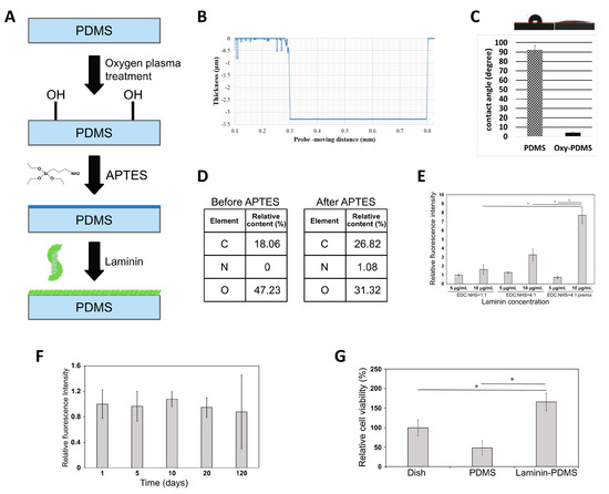 First, the PDMS film surface was pre-treated by oxidation via oxygen plasma treatment. In brief, the PDMS film surface was exposed to oxygen plasma (Junsun Tech Co., Ltd., New Taipei City, Taiwan) at 10-2 Torr for 5 min at 50 W, and an oxygen flow rate of 17 sccm, in order to create a hydrophilic surface (PDMS-OH). After that, aminization of PDMS surface (PDMS-NH2 was performed by immersing the PDMS film in 1% (v/v) APTES solution (Sigma-Aldrich, St. Louis, MO, USA) in absolute ethanol, followed by exposure to 5% (v/v) DI water in ethanol for 15 min at 75 °C in order to hydrolyze the silane. After that, the PDMS sample was washed once with 75% ethanol and three times with DI water to remove residual silane compounds. Finally, PDMS surface was conjugated with laminin by crosslinker 1-ethyl-3-(3-dimethylamino-propyl)-carbodiimide/N-hydroxyl-succinimide (EDC/NHS) (Sigma-Aldrich, St. Louis, MO, USA). To obtain a final concentration of 10 mM, EDC/NHS in 1:1 molar ratio was added to 10 μg/mL laminin in PBS buffer and the membrane was incubated for 1 h at 37 °C. Afterward, laminin-grafted PDMS film was washed in DI water to remove residual reagents. Before seeding the cells, PDMS film was rinsed again in PBS. Laminin binding efficiency was quantified by immunofluorescent staining by treating the membrane with anti-laminin primary antibody (ab11575, Abcam, Cambridge, MA, USA) for 4 h at 4 °C, followed by incubation with secondary antibody conjugated with FITC. Images were obtained using fluorescent microscope and a digital camera (DP72, Olympus, Tokyo, Japan) and intensity of fluorescent signal was quantitated using ImageJ software version 1.52a (National Institutes of Health, Bethesda, MD, USA).