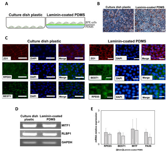 To study the growth of RPE cells on PDMS-coated film, they were differentiated from hiPSCs and grown in a normal cell culture dish and on top of laminin-coated PDMS (Figure 3A). hiPSC-RPE cells were well attached and grew on the modified PDMS scaffold with similar morphology to the cells grown on normal culture dish plastic, including their size, shape, melanin pigmentation and tight junction formation (Figure 3B). Furthermore, hiPSC-RPE cells cultured on modified PDMS film expressed RPE-specific markers, RPE65, BEST1, and ZO1, at comparable levels with the cells grown on plastic, as shown by immunofluorescence staining (Figure 3C). The expression of RPE-specific markers MITF and RLBP1 was confirmed by RT-PCR (Figure 3D), and the markers RPE65, BEST1, MITF, PAX6 by qRT-PCR (Figure 3E).
