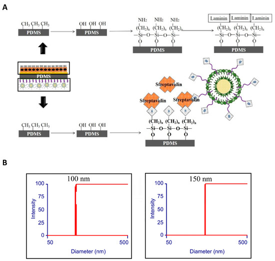 Preparation of modified PDMS membrane with attached dexamethasone-loaded liposomes. (A) Schematic diagram showing the process of preparation of liposome-loaded PDMS membrane. The top surface coated with laminin via the steps of hydroxylation, silanization and laminin crosslinking; the bottom surface loaded with liposomes via hydroxylation, silane-biotinylation, and noncovalent attachment of biotinylated liposomes via streptavidin bridges. (B) Liposome diameter measurement before (left) and after (right) loading with dexamethasone.