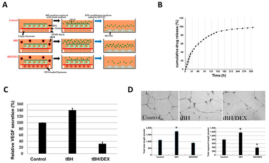 The inhibitory effect of dexamethasone (DEX) released from liposomes on tBH-induced angiogenesis. (A) Schematic representation of the experimental setup. (B) Dexamethasone-loaded liposome drug release profile, showing sustained drug release. (C) ELISA assay showing secretion of VEGF by hiPSC-RPE after stimulation with tBH. The values are the means from three independent measurements expressed as a percentage relative to the control with SD error bars. (D) The tube formation assay on HUVECs after stimulation with RPE-conditioned media as shown in (A). Representative bight-field images shown at the top, quantification of total tube length (left) and total segment length (right)—at the bottom. Original magnification, × 20. In (C,D), control—untreated HUVECs, tBH—HUVECs treated with tBH, tBH/DEX—HUVECs pretreated with tBH followed by exposure to an insert with the dexamethasone-loaded liposomes. The values in (B–D) are the means from three independent measurements with SD error bars. * p < 0.05 Student’s t-test, vs. control.