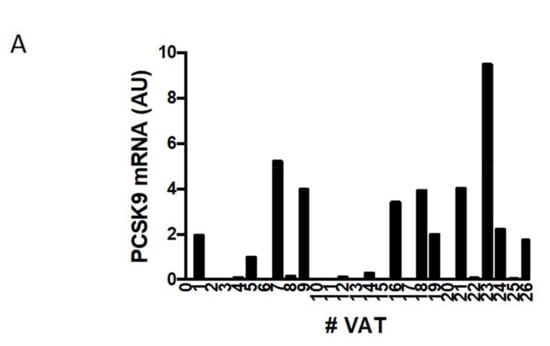 (A) PCSK9 gene expression in VAT. Cycle threshold of PCSK9 during real-time gene expression analysis for adipose tissue were between 21 and 24. (B) PCSK9 levels in differentiated human adipocytes. (C) PCSK9 in VAT according to BMI. # number of sample.