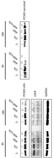 Moreover, when we tested the effect of LDL combined with ANP, we observed that LDL induced LDLR and the non-secreted form of PCSK9 after 4 h. At the same time, ANP is able to partially block the LDL-induced regulation. After 18 h, we confirmed that the LDL-mediated induction of PCSK9 was still present, and the PCSK9 secreted form was also significantly induced.