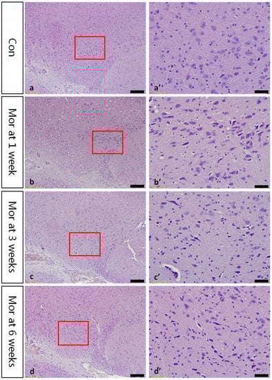 - Shi, W.; Ma, C.; Qi, Q.; Liu, L.; Bi, H.; Cong, B.; Li, Y. The effect of different durations of morphine exposure on mesencephalic dopaminergic neurons in morphine dependent rats. Neurotoxicology 2015, 51, 51–57. [Google Scholar] [CrossRef] [PubMed]
