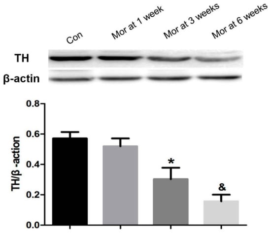 Western blotting analysis shows the expression of TH in the VTA. The expression of TH significantly decreased after three and six weeks of morphine dependence. Data are presented as the mean ± SEM (n = 4). * P < 0.05, & P< 0.01 vs. control group.