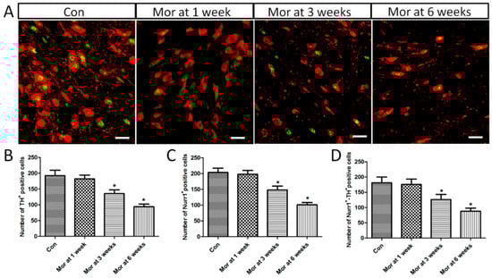 Among the transcription factors involved in the development and physiological function of mesencephalic dopaminergic neurons, tyrosine hydroxylase (TH), nuclear receptor related factor 1 (Nurr1), and pituitary homeobox 3 (Pitx3) play a critical role in many aspects of neuronal physiology [,,]. TH, the rate-limiting enzyme in dopamine synthesis [], is involved in neurotransmission, determining dopamine transmitter identity, and the survival of dopaminergic neurons [,]. Nurr1 is an orphan member of the nuclear receptor superfamily of transcription factors and is critical for the differentiation, migration, maturity, and survival of dopaminergic neurons in the mesencephalon [,], as well as being partially involved with non-dopaminergic neurons [,,]. It is also essential for the transcription of sets of genes, including Th, involved in dopaminergic neuron metabolism [,]. Pitx3 is another critical transcription factor for dopaminergic neurons. The gene encoding Pitx3 is expressed exclusively in mesencephalic dopaminergic neurons and activates the transcription of genes directly involved in the survival and maintenance of these neurons. However, it remains unclear what effects TH, Nurr1, and Pitx3 have on dopaminergic neurons relating to morphine dependence. To date, only two related studies have been published. A study by Horvath et al. [] showed the relationship between Nurr1 and opioid receptors in individuals addicted to heroin. Further, García-Pérez et al. [] described changes in TH, Nurr1, and Pitx3 in specific brain regions after one week of morphine exposure and morphine withdrawal in rats, but the changes after longer morphine dependence remain unclear. Therefore, in order to simulate human characteristics after long-term morphine exposure, we administered morphine to morphine-dependent rats for up to six weeks and investigated whether abnormalities in TH, Nurr1, and Pitx3 in the VTA are associated with dopaminergic neuron injury induced by chronic morphine dependence. The findings of the present study provide evidence of the mechanisms of nerve injury induced by chronic morphine dependence.