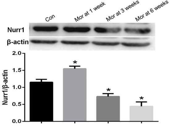 Western blot analysis of Nurr1 expression in the VTA. The relative level of Nurr1 in the VTA after one week of morphine exposure increased compared with the control group (P < 0.05). However, with prolonged morphine exposure, the relative Nurr1 expression of the three week and six week morphine-dependent groups decreased markedly (P < 0.05). Data are presented as the mean ± SEM. * P < 0.05 vs. control group (n = 4).
