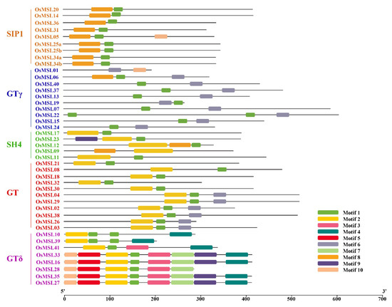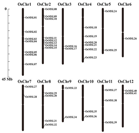 The extraction of the chromosomal information of the OsMSLs identified their chromosomal locations. As shown in Figure 1, all OsMSLs had precise positions in the chromosomes. Each rice chromosome contains ≥1 OsMSL. The OsMSLs are unevenly and non-randomly distributed on 12 chromosomes. Chr2 (chromosomal 2) contains the largest number of OsMSLs (eight) whereas Chr6 contains only one. The first four chromosomes contain 23 trihelix genes while chromosomes 5–12 have on average only 2–3 genes per chromosome. Therefore, OsMSLs are distributed mainly on the first four rice chromosomes. Although Chr2 is relatively short, it contains the most OsMSLs. Chr1 is the longest in rice and also contains numerous OsMSLs. Chr10, the shortest chromosome, contains two OsMSLs. In contrast, Chr6 is longer than Chr10 but contains only one OsMSL. There is no apparent correlation between the chromosome length and OsMSL gene distribution. Moreover, only OsMSL12 and OsMSL13 form gene clusters on Chr2.