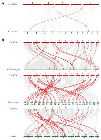 Synteny analysis of trihelix genes between rice and (A) dicotyledonous plant Arabidopsi thaliana, (B) monocotyledonous plant Brachypodium distachyon, wheat and maize. Gray lines in the background indicate the collinear blocks within rice and other plant genomes, while the red lines highlight the syntenic trihelix gene pairs. The species names with the prefixes ‘A. thaliana’, ‘B. distachyon’, ‘T. aestivum’, ‘Z. mays’ and ‘O. sativa’ indicate Arabidopsi thaliana, Brachypodium distachyon, Triticum aestivum, Zea mays and Oryza sativa, respectively. Red or green bars represent the chromosomes. The chromosome number is labeled at the top or bottom of each chromosome.