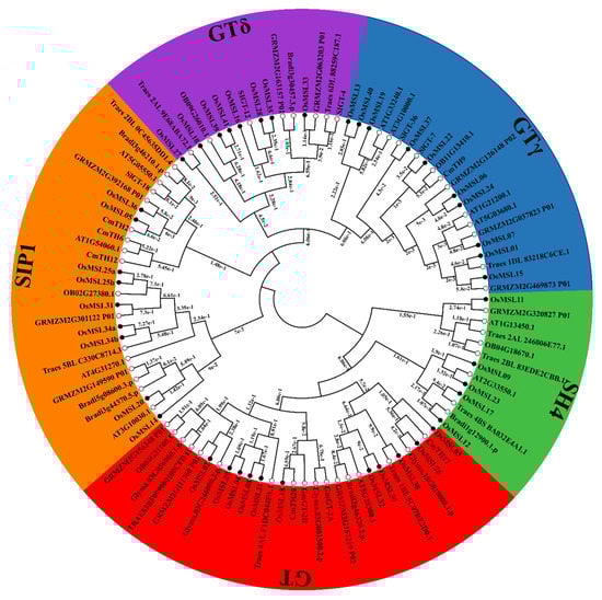 Phylogenetic relationships among 105 trihelix proteins in rice, Arabidopsis, soybean, maize, tomato, wheat, chrysanthemum, wild rice and Brachypodium distachyon. The maximum likelihood tree was created using MEGA v. 7.0 (bootstrap value = 1000) and the bootstrap value of each branch is displayed. Forty-three OsMSL proteins are marked with black circles and other species are marked with white circles. The phylogenetic tree was clustered into SIP1, GTγ, GT, SH4, and GTδ.