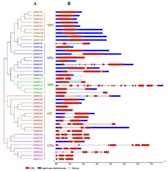 Phylogenetic analysis and gene structure of the rice trihelix family. (A) Phylogenetic analysis of the rice trihelix family. The phylogenetic tree was constructed based on the full-length amino acid sequences of the rice trihelix proteins by using MEGA v. 7.0 with the maximum-likelihood method. Bootstrap = 1,000. SIP1, GTγ, GT, SH4, and GTδ are marked with different colors. (B) Gene structures of the rice trihelix family. These were analyzed by the Gene Structure Display Server (GSDS v. 2.0). Exons, introns, and untranslated regions are marked by round red rectangles, black lines, and blue rectangles, respectively. The scale bar at the bottom estimates the lengths of the exons, introns, and untranslated regions.