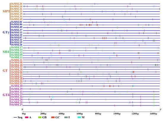 To identify the differences between the rice trihelix family genes, we analyzed the OsMSL gene structure by comparing each coding sequence with its corresponding genomic sequence. As shown in Figure 5B, the number of OsMSL exons is discontinuously distributed from 1 through 18. Combining the gene structure with the phylogenetic tree, we found that the OsMSL exon-intron distribution is related to its classification. Closely related genes usually have homologs. Therefore, their gene structures are similar. For example, the OsMSL genome sequences in the SIP1 subfamily have no introns and only one exon. Therefore, the evolution of this gene subfamily is relatively conservative. The genes in the GTδ subfamily have no UTR region and only exons and introns except for OsMSL16 and OsMSL41. In contrast, the structures of the various genes in the GTγ, GT, and SH4 subfamilies are relatively different. These results indicate that although the OsMSLs are subdivided into five families, their genes are relatively conservative.