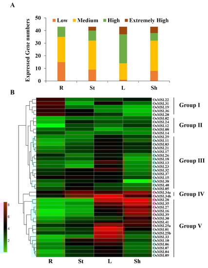The OsMSLs were clustered into groups I to V according to their expression characteristics in different tissues (Figure 8B). OsMSLs in groups I and II expressed at lower levels in all tissues, but members in group I displayed relatively higher expression in root tissue. For instance, although OsMSL19 maintained very low expression levels in most tissues, its expression displayed a distinct enrichment in root. In contrast, the genes in group II, especially OsMSL02, OsMSL08, and OsMSL12, remained low in the various tissues. On the other hand, in Arabidopsis, the At5g63420 gene, the orthology of OsMSL12, is highly expressed specifically in the seeds, suggesting that also OsMSL12 could show a dominant expression level in seeds rather than in any of these four tissues [19]. Contrary to the group I, most of the genes in group III expressed at higher levels in the stems or leaves and at lower levels in the roots. However, the transcription levels of OsMSL34a and OsMSL34b in group IV were high in all four tissues. Group V members also displayed tissue specific expression, but expressed at higher levels than group I and III. Besides, the genes in group V, especially OsMSL16, OsMSL27, OsMSL28, OsMSL35, and OsMSL39, expressed extremely highly in the leaves and sheaths, whereas their expression levels in the roots and stems were lower than those of genes in group I and III, respectively. In conclusion, OsMSLs displayed tissue expression specificity, indicating their potential roles in different mechanisms.