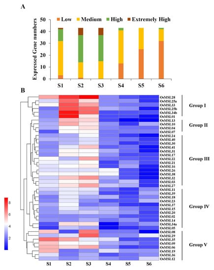 We also investigated the OsMSL expression profiles at different rice developmental stages including 7 (S1), 20 (S2), 40 (S3), 80 (S4), 100(S5), and 140(S6) days after sowing. As shown in Figure 9A, the numbers of genes with high- and extremely high expression levels are greater in S2 and S3 than in the other stages. In contrast, no genes expressed at high levels during S4, S5, or S6. The genes were subdivided into five groups according to their expression characteristics at different stages (Figure 9B). OsMSLs in group I, were at comparatively higher transcription levels during the S2 and S3 stages except for OsMSL28, which displayed high expression levels at S1 stage as well. In general, the expression levels of the genes in groups II and III were similar to those in group I, but their expression levels in S2 and S3 were lower than in group I. Notably, the group IV genes had lower expression levels than the other four clusters at almost all developmental stages. Contrary to groups II and III, high gene expression levels were observed mainly at S1 in group V. Besides, with the exception of OsMSL35 and OsMSL06, all other genes in group V expressed at significantly lower levels by S2. In conclusion, OsMSLs play a potential role at early developmental stages.