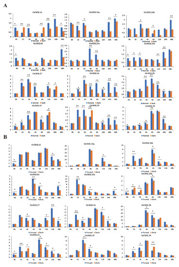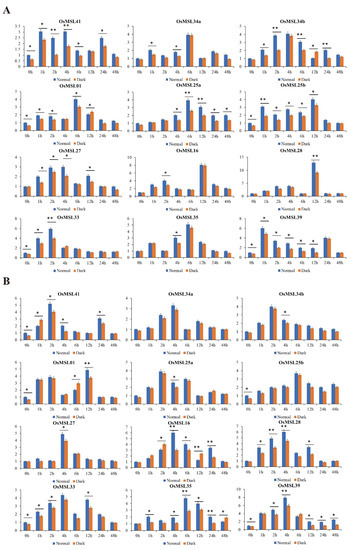 To determine whether light influences trihelix genes expression, the expression levels of 12 OsMSLs from each treatment group under light and dark conditions were investigated (Figure 10 and Figure 11). Overall, some OsMSLs were induced under normal conditions. For example, at 0 h, OsMSL01, OsMSL25b, OsMSL33, OsMSL39, and OsMSL41 expression levels significantly differed between the two conditions. Several genes began to be light-regulated expressed under different treatments. For instance, after ABA exposure, the expression levels of OsMSL16, OsMSL25a, OsMSL25b, OsMSL28, OsMSL34a, and OsMSL39 at different time points under normal conditions were significantly higher than those at the same intervals under dark conditions. In contrast, some genes were repressed by light at different points, such as the expression levels of OsMSL41 at 2 h under ABA treatment, OsMSL28 at 6 h under hydrogen peroxide treatment, OsMSL34b at 12 h under drought stress and OsMSL16 at 12 h under high salty stress were higher in the dark than under normal conditions. Therefore, the relationship between trihelix genes and light is complex and trihelix gene expression is not directly regulated by light but may be controlled by multiple regulatory mechanisms.