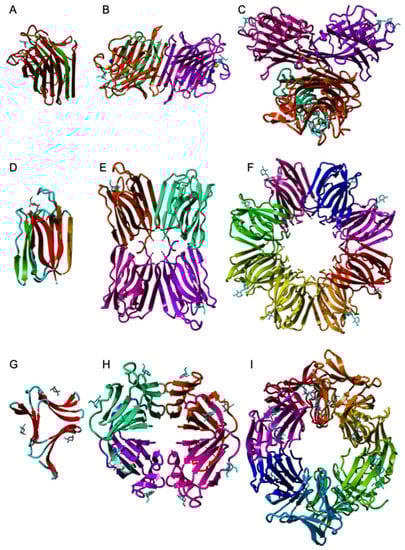 An unusual six-bladed β-propeller organization built up from 4-stranded anti-parallel β-sheets was identified in tectonin 2, a lectin from the mushroom Laccaria bicolor AAL (PDB code 5FSC), that specifically recognizes O-methylated glycans [148] (Figure 4).