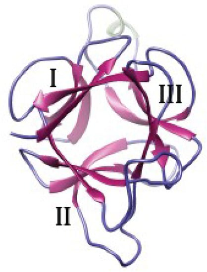 Three-dimensional models for the EUL domain of EUL-domains of rice lectin Orysata, showing the β-trefoill organization made of three bundles of antiparallel β-sheets (I, II, III).