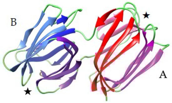 Three-dimensional model of griffithsin (PDB code 2GTY), showing the β-prism organization made of three four-stranded β-sheets in each monomer. The four stranded β-sheets are colored red, pink and magenta in monomer (A), and blue, light blue and purple in monomer (B), respectively. The stars indicate the localization of the carbohydrate-binding sites in each monomer.