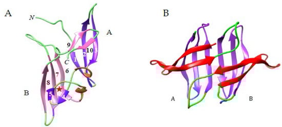 The cyanovirin-fold (CVN-fold) also occurs as a structural scaffold identified in the cyanovirin-N family of mannose-binding fungal lectins, including the ascomycetous fungi Ceratopteris richardii (CrCVNH), Neurospora crassa (NcCVNH) and Tuber borchii (TbCVNH) [155]. The NcCVNH lectin consists of a two swapped domains polypeptide chain of 111 amino acids, built up from a domain A of 56 residues (residues 1–42 and residues 100–111), and a domain B of 57 residues (residues 43–99). According to the swapping occurring between both domains, domain A comprises the triple-stranded β-sheet (β1, β2, β3) associated to the β-hairpin (β9, β10), whereas domain B consists of the triple-stranded sheet (β6, β7, β8) associated to the β-hairpin (β4, β5) (Figure 6A). Other CrVNH and TbCVNH exhibit a very similar organization.