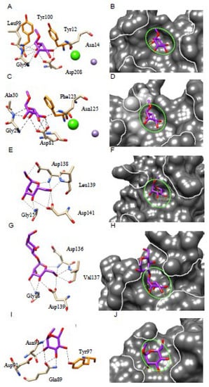 (A,B). ConA from Canavalia ensiformis in complex with α-methylmannoside (PDB code 5CNA). (C,D). Isolectin LoLI from Lathyrus ochrus in complex with Man (PDB code 1LOB). (E,F). Artocarpin from Artocarpus integrifolia in complex with α-mthylmannoside (PDB code 1J4U). (G,H). Heltuba from Helianthus tuberosus in complex with Manα1,3Man (PDB code 1C3M). (I,J). Third Man-binding site of GNA from Galanthus nivalis in complex with α-methylmannoside (PDB code 1MSA). Hydrogen bonds connecting the monosaccharides to the amino acid residues forming the monosaccharide-binding site are represented by black dashed lines. Aromatic residues participating in stacking interactions with the sugar rings are colored orange. The molecular surface of the lectins is colored dark grey and their extended oligosaccharide-binding areas are delineated by white dashed lines. The shallow depression corresponding to the monosaccharide-binding site that accommodates simple sugars is delineated by a green dashed line. The green and violet spheres correspond to the Ca2+ and Mn2+ ions, that have a stabilizing effect on the carbohydrate-binding site.