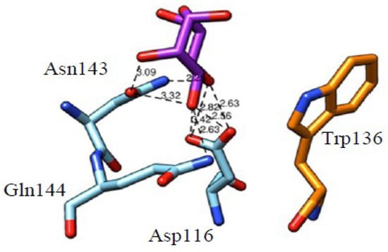Docking of αMeMan to the monosaccharide-binding site of the active sub-domain III of OsEULS3. Hydrogen bonds connecting Man to the amino acid residues forming the monosaccharide-binding site are shown by black dashed lines and distances are indicated in Å. The aromatic Trp136 residue participating in stacking interactions with the sugar ring is colored orange.