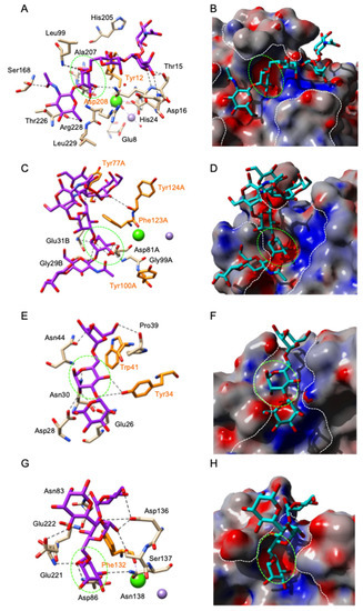 Detailed structural information is available for the binding of α-D-mannose (Man) to the monosaccharide-binding site of Man-specific legume lectins including Con A [202], LoLI isolectin from Lathyrus ochrus [206], favin from the broad bean Vicia faba [63], pea lectin PsA [209] and PAL from Pterocarpus angolensis [210]. A very similar binding scheme occurs for both the two-chain (LolLI, favin, PsA) and single-chain (Con A) lectins: a few amino acid residues located on three distinct loops exposed at the top of the dome-shaped lectin protomer, form a shallow depression which accommodates the Man ligand via a network of hydrogen bonds connected to the O3, O4, O5 and O6 atoms of the sugar. An acidic residue (Asp208 of Con A, Asp81 of LoLI and PsA), which also participates in the binding of a Ca2+ ion located in the close vicinity of the binding site, plays a key role in ligand binding. An additional stacking interaction between the pyranose ring of Man and one (Phe123 of LoLI) or two (Tyr12 and Tyr100 of Con A) aromatic residues located in the vicinity of the monosaccharide-binding site, reinforces anchorage of the sugar to the binding site (Figure 7A–D). A few water molecules also participate in the binding of Man to the monosaccharide-binding site of the lectins. Very similar binding observations were reported for the binding of Man or α-methyl-D-mannoside (MeMan) to other Canavalia [20,21,25,27] and Dioclea lectins [34,35,36,37,38,39,40,41,42,43,44], Parkia biglobosa (PDB code 4MQ0) and Cymosema roseum (PDB code 4MYE) Man-specific lectins from the Brasilian flora.