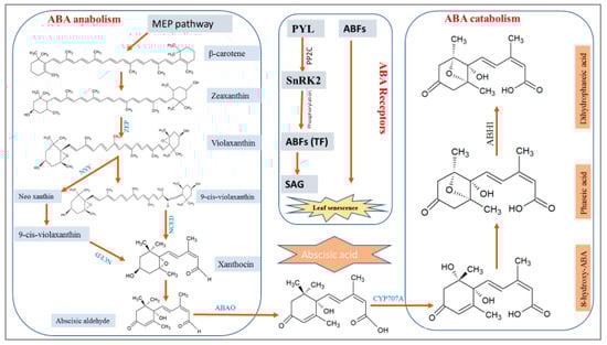 Abscisic acid (ABA) biosynthesis, ABA catabolism, and ABA signaling sensors (receptors) pathways. SAG: senescence-associated gene, In MEP (Methyl Erythritol Phosphate), β-carotene is converted into zeaxanthin, ZFP (zeaxanthin epoxidase) catalyze zeaxanthin into violaxanthin, NSY (neo xanthin synthase) convert violaxanthin into neo xanthin and 9 cis-violaxanthin, NCED (9-cis-epoxycarotenoid dioxygenase) convert 9 cis-violaxanthin into xanthocin and then abscisic aldehyde, ABAO: abscisic aldehyde oxidase catalyzes abscisic aldehyde into abscisic acid. ABA is sensed by ABA receptors; PYL (pyrabactin resistance 1-like), PP2C (protein phosphatase 2C) which activate SnRK2. The activated SnRK2 phosphorylate ABFs (ABA-responsive element-binding factors) to induce the expression of SAGs (senescence-associated genes).