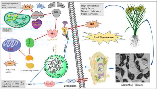 As the dominating phytohormone, ABA regulates the internal metabolic functions to alleviate the harms of environmental stresses. Leaf senescence is a temporal niche with integrated aging and phytohormone regulatory factors. The dominating environmental stresses intervene with phytohormone regulatory factors to trigger and/or accelerate leaf senescence, which is a limiting factor of quantitative and qualitative traits. From the regulation of physiological processes during leaf senescence, and pre-transcriptional changes, to post transcriptional alteration, the ABA working pattern is controlled by a network of ABA biosynthesis, ABA transport, and ABA signaling receptors, and ABA catabolism depends upon ABA biosynthesis. The major regulators of ABA biosynthesis, ABA transport, receptors, and ABA catabolism are NCED, PYL, MRP, and CYP families, respectively. ABA regulates NYCs and D1 protein to start Chl degradation and destruction as the first sign to limit, reduce, or terminate photosynthesis. ABA integrates with antioxidant responses and triggers the pre-transcriptional induction of NOXs to modulate NADPH oxidase for ROS generation. In addition to an increase in H2O2, SOD, APOD, GR, and CAT, a decrease in AsA and GSH contents is observed in rice leaves.