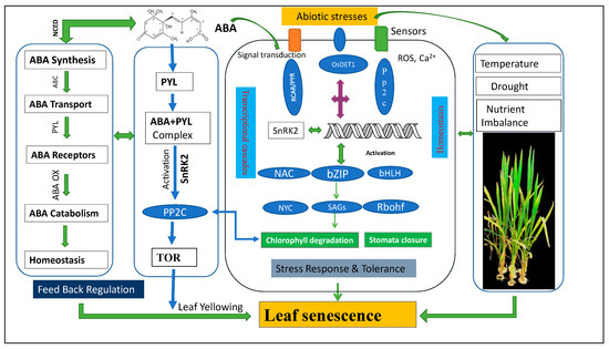 ABA triggers metabolic changes to induce leaf senescence in old leaves for the survival mechanism of sprouting leaves. However, once stress overwhelms the homeostasis mechanism, leaf senescence dominates to induce premature leaf senescence, which may reduce yield, and premature leaf senescence may serve as a pruning limiting factor to enhance productivity in modern agriculture. Within plants, the consolidated structure of endogenous ABA depends on ABA biosynthesis, transport, ABA signaling, and catabolism, which may constitute the central role leading routine leaf senescence. ABA coordination with dominating environmental stresses causes premature leaf senescence, which consequently reduces yield in crops by limiting the growth phase. Thus, information about the mechanism of ABA-mediated leaf senescence not only enhances our understanding of a fundamental biological process but also possibly provides a means to control leaf senescence for the improvement of crop yield. ABA synthesis and propagation have been reviewed already [23,24], but the complete crosstalk between ABA and leaf senescence should be elaborated. In this paper, we discuss the ABA core pathways for the induction of leaf senescence, starting from ABA biosynthesis and catabolism, ABA transport, and ABA signaling receptors. Then, the integrated mechanism of abiotic factors with ABA for the induction of premature leaf senescence, covering the chloroplast degradation and photosynthesis decline, ROS generation and oxidative stress, kinase protein regulation, and secondary messenger Ca2+ are discussed. Pre-translational changes such as the activation of TFs (NACs, bZIPs, WRKYs) are explained to regulate the expression of senescence associated genes (SAGs) in Arabidopsis and rice, and the future prospects of TFs related with other plants are proposed. Post-translational factors of membrane-associated proteins and target of rapamycin during leaf senescence are also discussed. The modifications of genes involved in the regulation of plant responses to ABA and potential prospects regarding the improvement of plant regulation are also described. Our review covers recent findings about the interaction of ABA with carbon and sugar signaling as well as ethylene to induce leaf senescence.