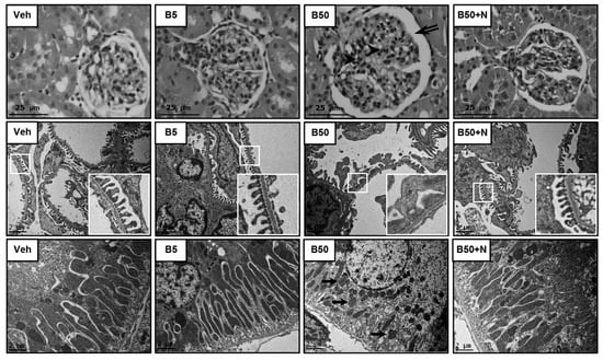 Photomicrographs of the kidney tissues following bisphenol A exposure and N-acetylcysteine treatment. Upper panel shows kidney sections stained with hematoxylin and eosin (H&E, 40×). Middle and lower panels show transmission electron micrographs of the glomerulus and renal tubules, respectively (original magnification: 3000×). The boxed areas are magnified in the right lower panel. Veh: vehicle-treated group; B5 and B50: bisphenol A-treated group at 5 and 50 mg/kg, respectively; B50 + N: BPA (50 mg/kg) plus N-acetylcysteine (100 mg/kg)-treated group. Double arrow, arrowhead, and arrow denote increased urinary space, mesangial proliferation, and mitochondrial swelling, respectively.