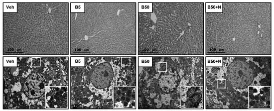 Photomicrographs of the liver tissues following bisphenol A exposure and N-acetylcysteine treatment. Upper panel shows liver sections stained with hematoxylin and eosin (H&E, 10×). Lower panel shows transmission electron micrographs of the hepatocyte (original magnification: 2000×). The boxed areas are magnified in the right lower panel. Veh: vehicle-treated group; B5 and B50: bisphenol A-treated group at 5 and 50 mg/kg, respectively; B50 + N: BPA (50 mg/kg) plus N-acetylcysteine (100 mg/kg)-treated group.