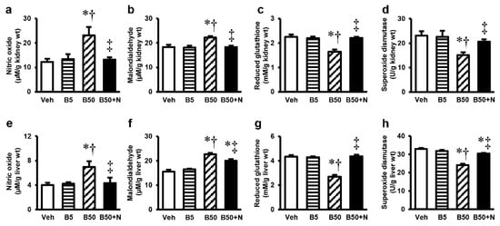 Effects of bisphenol A exposure and N-acetylcysteine treatment on kidney (a–d) and liver (e–h) oxidative stress. Values are means ± SEM (n = 6). Veh: vehicle-treated group; B5 and B50: bisphenol A-treated group at 5 and 50 mg/kg, respectively; B50 + N: BPA (50 mg/kg) plus N-acetylcysteine (100 mg/kg)-treated group. * p < 0.05 vs. Veh, † p < 0.05 vs. B5, ‡ p < 0.05 vs. B50.