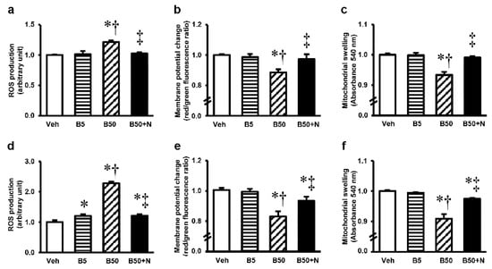 Effects of bisphenol A exposure and N-acetylcysteine treatment on kidney (a–c) and liver (d–f) mitochondrial functions. Values are means ± SEM (n = 6). Veh: vehicle-treated group; B5 and B50: bisphenol A-treated group at 5 and 50 mg/kg, respectively; B50 + N: BPA (50 mg/kg) plus N-acetylcysteine (100 mg/kg)-treated group. * p < 0.05 vs. Veh, † p < 0.05 vs. B5, ‡ p < 0.05 vs. B50.