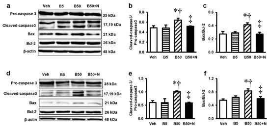 Representative images of western blots and the quantitative analyses of cleaved-caspase3/pro-caspase3 and Bax/Bcl-2 in renal cortical tissues (a–c) and liver tissues (d–f). Values are means ± SEM (n = 6). Veh: vehicle-treated group; B5 and B50: bisphenol A-treated group at 5 and 50 mg/kg, respectively; B50 + N: BPA (50 mg/kg) plus N-acetylcysteine (100 mg/kg)-treated group. * p < 0.05 vs. Veh, † p < 0.05 vs. B5, ‡ p < 0.05 vs. B50.