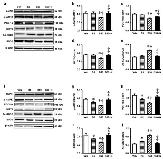 Representative images of western blots and the quantitative analyses of p-AMPK/AMPK, SIRT3/β-actin, PGC-1α/β-actin and Ac-SOD2/SOD2 in renal cortical tissues (a–e) and liver tissues (f–j). Values are means ± SEM (n = 6). Veh: vehicle-treated group; B5 and B50: bisphenol A-treated group at 5 and 50 mg/kg, respectively; B50 + N: BPA (50 mg/kg) plus N-acetylcysteine (100 mg/kg)-treated group. * p < 0.05 vs. Veh, † p < 0.05 vs. B5, ‡ p < 0.05 vs. B50.