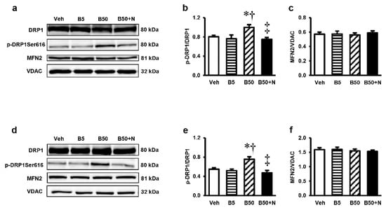 Representative images of western blots and the quantitative analyses of p-DRP1/DRP1 and MFN2/VDAC in renal cortical tissues (a–c) and liver tissues (d–f). Values are means ± SEM (n = 6). Veh: vehicle-treated group; B5 and B50: bisphenol A-treated group at 5 and 50 mg/kg, respectively; B50 + N: BPA (50 mg/kg) plus N-acetylcysteine (100 mg/kg)-treated group. * p < 0.05 vs. Veh, † p < 0.05 vs. B5, ‡ p < 0.05 vs. B50.