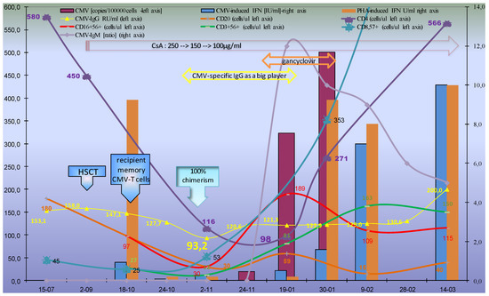 It is a clinical paradigm that anti-CMV-IgG-positive donors facilitate post-transplant immunological recovery and chronic CMV infection affects the immune system [9]. On the other hand, a seronegative donor and conditioning with T cell depleting agents (anti-thymocyte globin or alemtuzumab) are associated with reduced GvHD and the delay in immune reconstitution shows a severe drawback [19]. Weak CD4 increase, preferentially CD8+ expansion and a CD8CD57+ increase were observed (Figure 1). This corresponds with previous data: ratios of CD4+ to CD8+ cells were significantly and persistently lower in the ATG-treated patients within prolonged period (years) with increased regeneration of the CD8+ bright CD57+ subpopulation [19,20]. Of note, following the manufacturer’s (Fresenius) data, ATG shows high reactivity to T (CD2, CD3, CD4/8, TCR), B cells (CD19, CD20, CD40), and plasma cell (CD38) antigens, without reactivity to NK cells. Therefore, the serum IgG level during first months after transplantation reflects the IgG half-life and the decrease of the recipient’s humoral immune response. The lymphocyte B and CD4-helper role was blocked by ATG together with other immunosuppressants (here–CsA, Figure 1). Interestingly, because of a seronegative donor, a residual recipient’s IgG-class antibody was the sole and exclusive factor of CMV-specific immune response during its switching (Figure 1). Contrary to my observation, most of the literature, especially data from EBMT/NMDP database, are devoted to the influence of the donor CMV serostatus on overall survival with conflicting results [5,6,9,21]. Unfortunately, EBMT analysis did not include in vivo T cell depletion therapy [21] and serostatus was analyzed as a qualitative data. In a similar to this case CMV constellation i.e., R+ (recipient CMV-positive), the estimated 5-year overall survival after HLA-identical sibling HSCT was 52% both for CMV-seropositive and -seronegative donors [21].