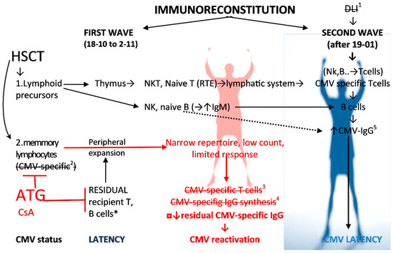CMV specific reconstitution as a hallmark of adoptive immunorecovery after HSCT. The figure shows the evolution of an adoptive immune response to CMV against the backdrop of the influence of clinical factors in the presented case (Figure 1) with ineffective first wave immunoreconstitution. The crossed-out elements are absent in the presented case: 1 DLI as well as 2 donor memory (and effector) lymphocytes from the graft in our case do not contain CMV-specific cells (donor was seronegative D−) (see Table 2). * Residual CMV-specific recipient T and B cells are blocked by the lymphocyte depleting conditioning. The T cell compartment was also blocked using immunosuppressive therapy with CsA. 3,4 ATG blocks the first wave of renewal in a significant way. It works on cellular compartment (i.e., cells by CD2, CD3, CD4/8, TCR) as well as humoral counterpart (B cells by CD19, CD20, CD40, and plasma cells CD38), and therefore CMV-IgG synthesis. Lymphocyte repertoire is in first wave very narrow because of lymphocyte depletion. Small amount of NK, B lymphocytes and (to a lesser extent) T/NKT cells survived the conditioning. Therefore, in my report the first wave of adoptive immunoreconstitution was weak (without CMV-specific T and B cells, and CMV-IgG synthesis). Noteworthy, for months, the sole and exclusive factor of CMV-specific immune response were the recipient’s residual IgG with their gradual decrease (Figure 1). 5 De novo IgG synthesis may be observed without T cells and IgM switching as the result of CMV and TLR3 interaction [17] as indicated by the dotted line. Abbreviation: RTE—recent thymic emigrants, ATG—anti-thymocyte globin, CsA—cyclosporine A.