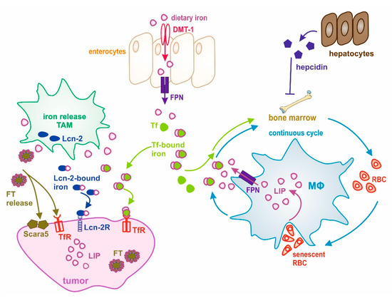 Schematic overview of the interplay between systemic and local iron homeostasis in the tumor. Dietary iron is absorbed by enterocytes through divalent metal transporter 1 (DMT-1) and released to the circulation through the iron exporter ferroportin (FPN). After its release, iron is rapidly loaded onto transferrin (Tf) for systemic transport. Macrophages (MΦ) take a central role in maintaining systemic iron homeostasis, which is accomplished through a continuous cycle of iron recycling from senescent red blood cells (RBCs). Iron then joins the labile iron pool (LIP) and is then donated to the circulation, where it is bound to Tf for its transport to cells and tissues having a need for iron or to the liver, where iron is stored. Systemic iron homeostasis is controlled by the expression of hepcidin from hepatocytes. During cancer, this cycle is deregulated and systemic iron availability is decreased through its sequestration within MΦ, finally causing anemia. At the tumor site, tumor-associated macrophages (TAM) adopt an iron-release phenotype and donate iron to the microenvironment. Iron can be released via FPN and loaded onto Tf for its uptake by cancer cells via the Tf receptor (TfR). Alternative iron donation pathways have evolved: (1) lipocalin-2 (Lcn-2)-bound iron is taken up by its high-affinity receptor Lcn-2R, and (2) macrophage-released ferritin (FT) might be taken up through Scara5 (FTL) or TfR (FTH) by tumor cells.
