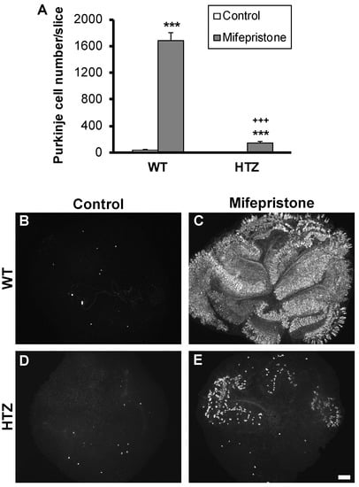 - Ghoumari, A.M.; Dusart, I.; El-Etr, M.; Tronche, F.; Sotelo, C.; Schumacher, M.; Baulieu, E.E. Mifepristone (RU486) protects Purkinje cells from cell death in organotypic slice cultures of postnatal rat and mouse cerebellum. Proc. Natl. Acad. Sci. USA 2003, 100, 7953–7958. [Google Scholar] [CrossRef] [PubMed]
