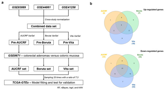 According to the results, 747, 179, and 953 genes passed the selection criteria for AUCRF, Boruta, and Vita, respectively. They were redundant and not representative for the early stage of the disease, which is essential for diagnostic biomarkers. Hence, we filtered them with dysregulated genes in adenomas. After being filtered, only 41 (8 up-regulated, 33 down-regulated), 42 (7 up-regulated, 35 down-regulated), and 71 (18 up-regulated, 53 down-regulated) genes remained. Interestingly, the Boruta-derived biosignature was a part of the Vita-derived biosignature. There were 5 up-regulated genes and 21 down-regulated genes in common among three methods. Thus, AUCRF possessed only one distinct up-regulated gene and one distinct down-regulated gene (Figure 1b). ADH1C, GBA3, and CD177 were not found in the RNA-seq and were eventually removed from the classification and validation process. Ultimately, there were 39, 41, and 68 individual markers from AUCRF, Boruta, and Vita, respectively.
